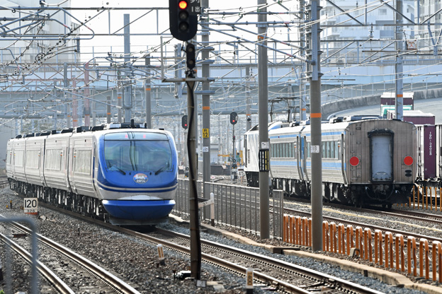 (left) 59D the limited express "Super Hakuto No.9" : HOT7014+HOT7031+HOT7047+HOT7055+HOT7004, (right) Sanyo Line No.9863 : EF210-157+KIHA185-1017+KIHA185-1016 at Takatori 2026/1/15