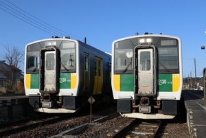 ↑横田駅で交換するキハE130-103最後尾の924D(左)とキハE130-110先頭の923D(右)