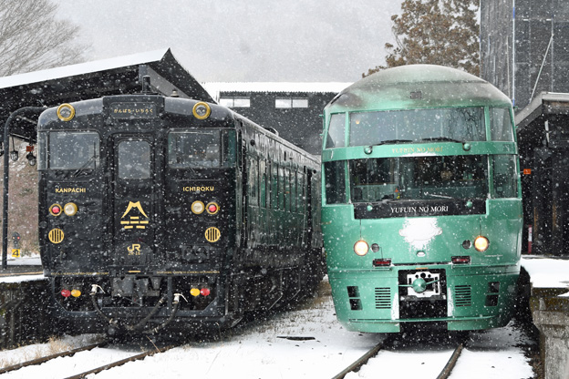 久大本線8042D(いちろく):2R-38+2R-80+2R-16、8001D 特急“ゆふいんの森1号”:キハ72-1+キハ72-2+キハ72-3+キサハ72-4+キハ72-5 久大本線由布院 2026/2/8