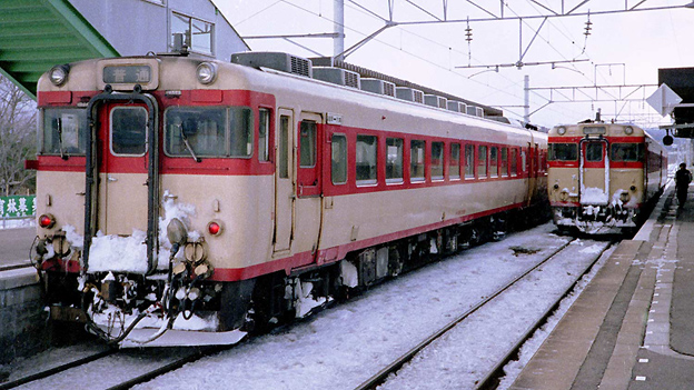 国鉄時代のキハ282509(左)とキハ581518(右)。キハ282509は長野から秋田に転属して最初の冬。 田沢湖線雫石 1987/2 撮影:関谷秀樹
